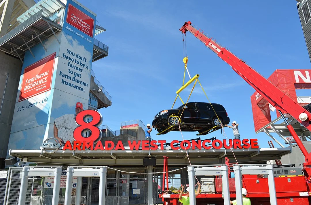 I led the creative vision and implementation of the stadium’s first major physical transformation: the Nissan Stadium exterior signage system. The creative and engineering challenge centered on installing massive illuminated letterforms onto both sides of an aging stadium structure while accounting for wind loads, thermal movement, long-span vibration, and even seismic activity.